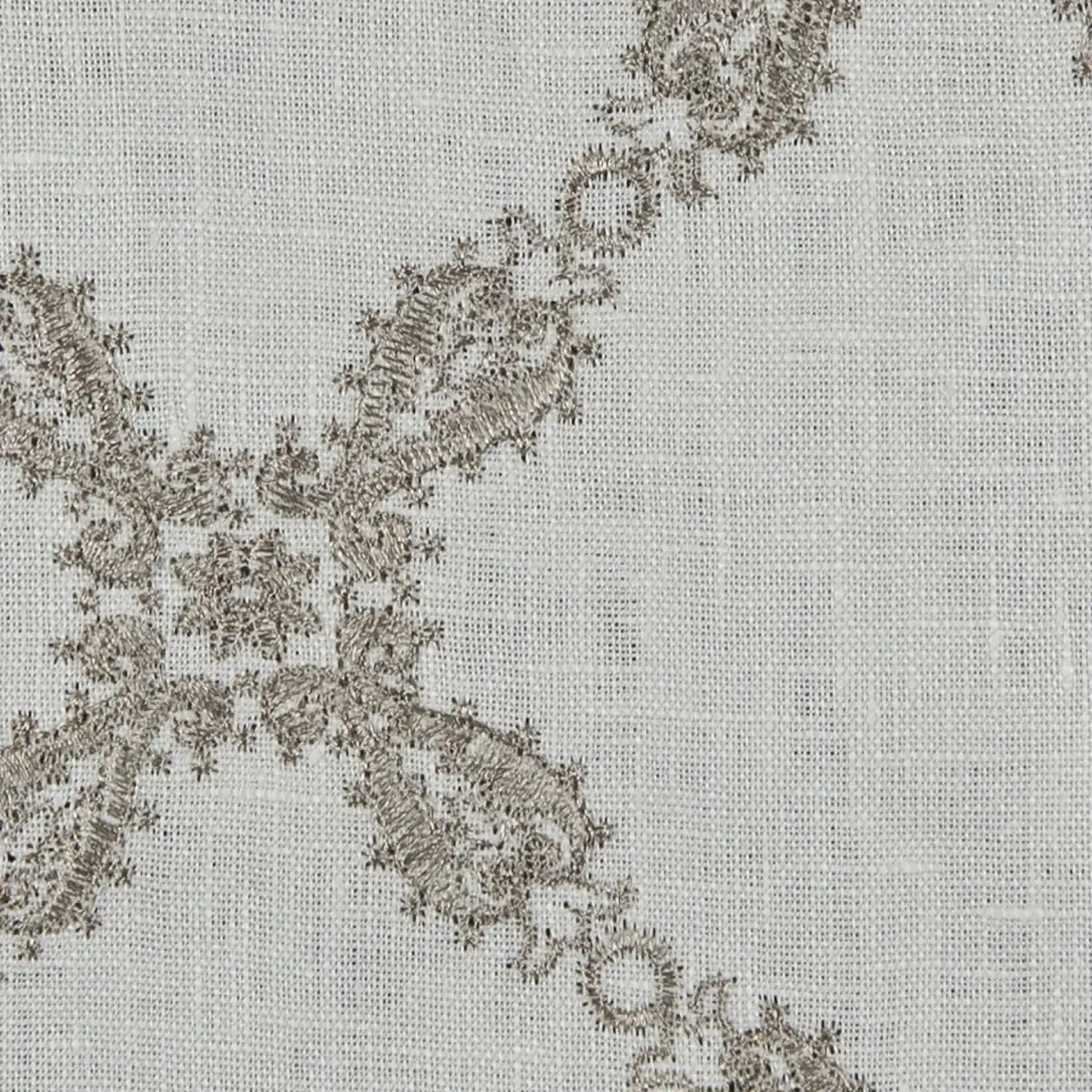 Linen Lace is a demur lace like pattern motif embroidered on a linen blend ground. Linen Lace coordinates directly back to Linen Touch Plain, Linen Leaf and Linen Floral. Great for top of the bed, window treatments and home décor.